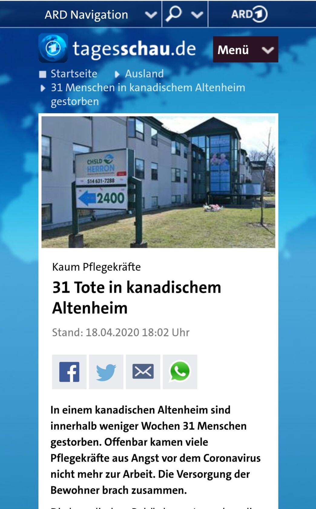 Новости Канады в доме престарелых умер 31 человек, 5 от коронавируса и 26 от того что медперсонал испугался на работу из за вируса идти, не пришёл и не сообщил никому.....